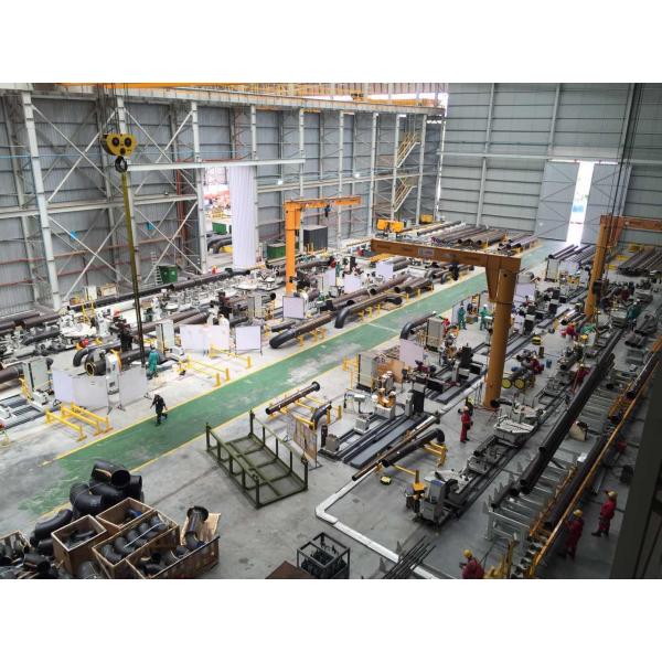 This production line is customised with advanced design. Conveyor system between each station reduces the occupation of overhead crane. The line can achieve automatic pipe loading, length measuring, cutting and chamfering, fitting for welding, tack welding, automatic root pass welding, filing and capping, which dramatically promotes the quality and productivity.